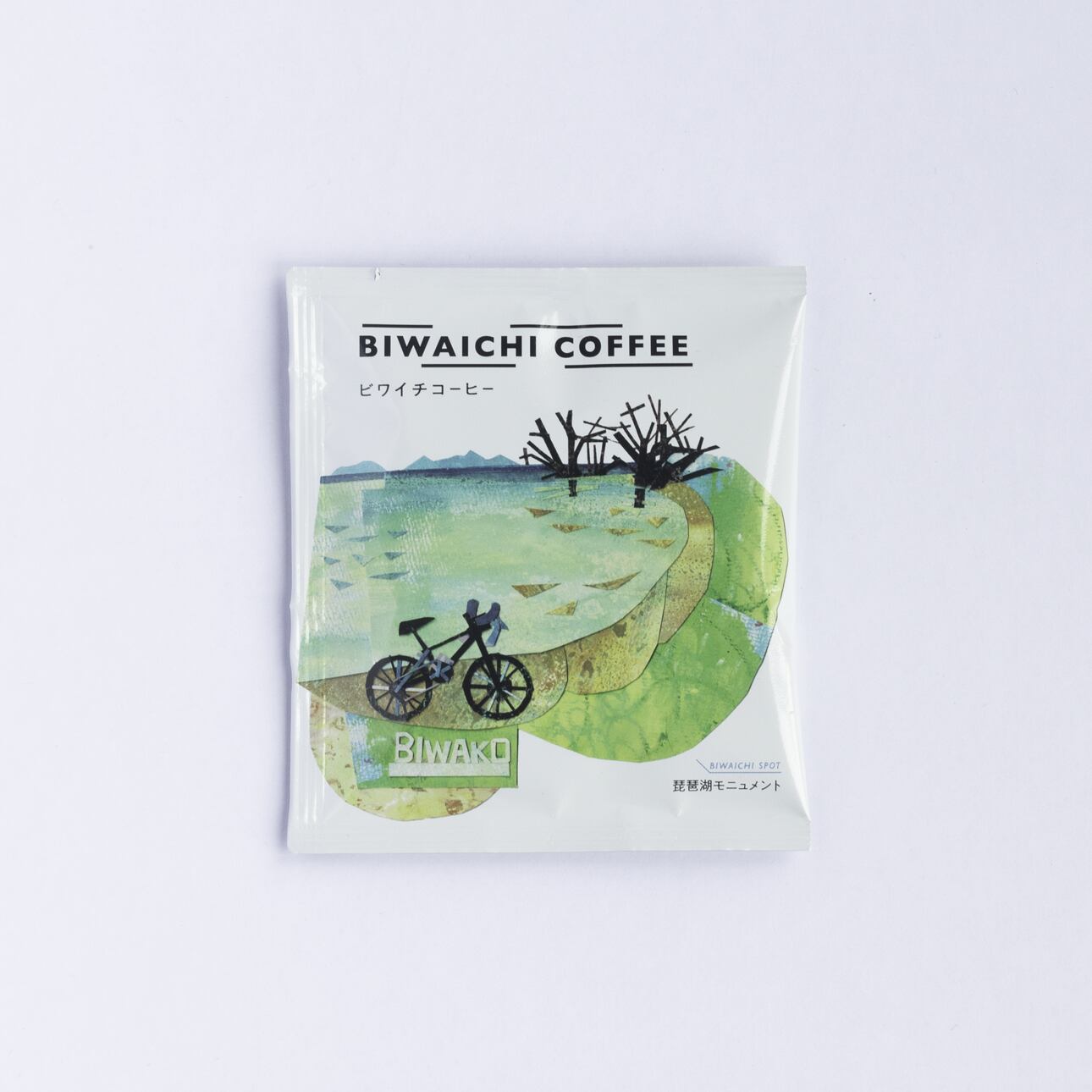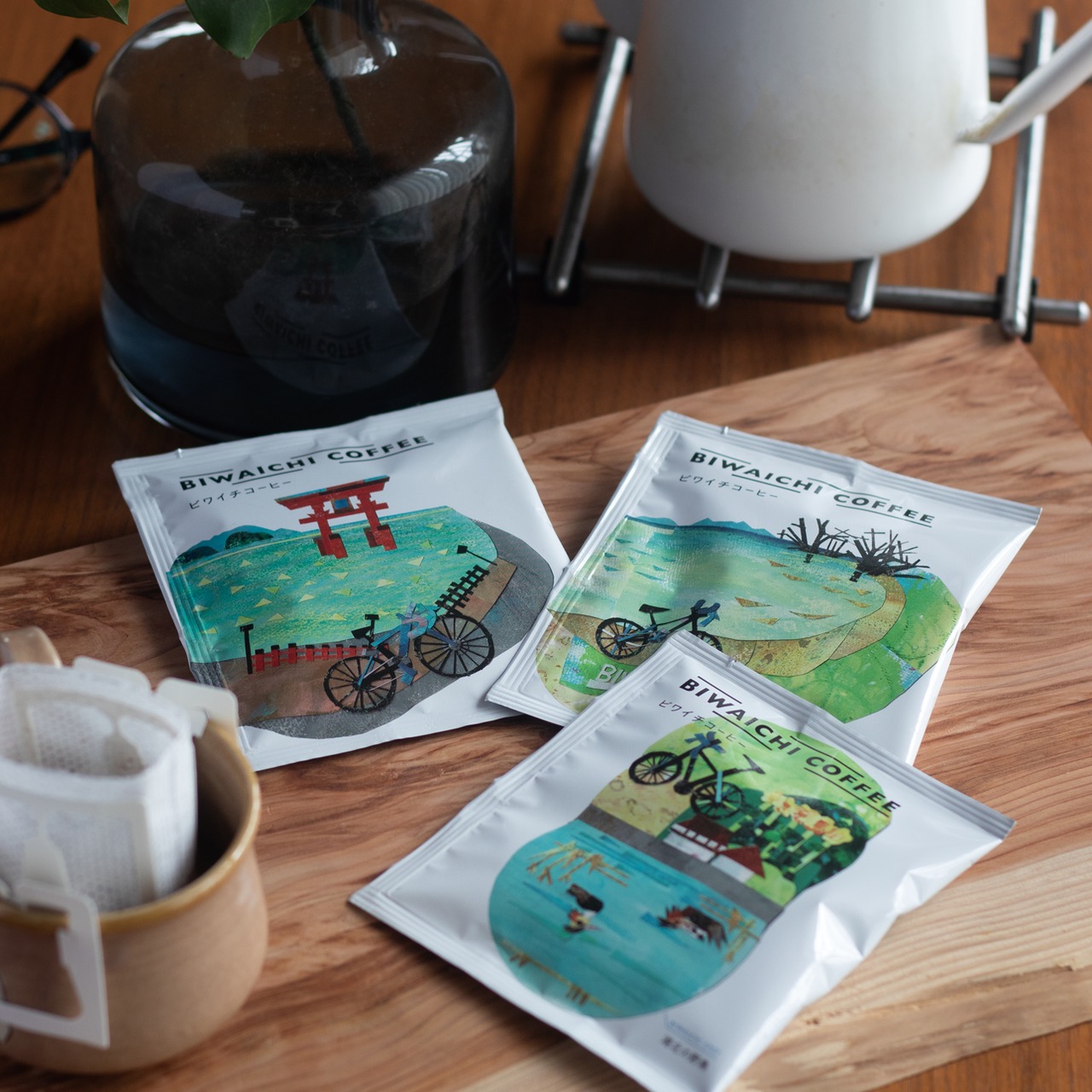 ビワイチを代表する景色をイメージした3種類の味わいのコーヒーを、滋賀県在住のイラストレーター増田有貴氏の切り絵で描いたパッケージデザインのドリップバッグに仕上げました。